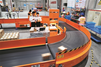 廣州海關所屬南沙海關關員在南沙保稅港區的跨境電商倉庫巡倉監管。